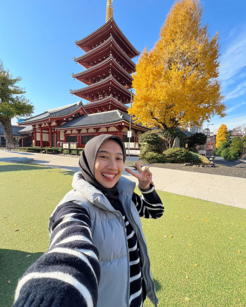 • First stop kita menuju area Asakusa untuk mengunjungi Senso-ji Temple, kuil Buddha tertua di Tokyo. Disini kamu bisa explore Nakamise Street, banyak jajan tradisional dan souvenir. Kamu juga bisa mencoba Baju Jepang Yukata atau naik Becak Manusia yang viral (opsional)